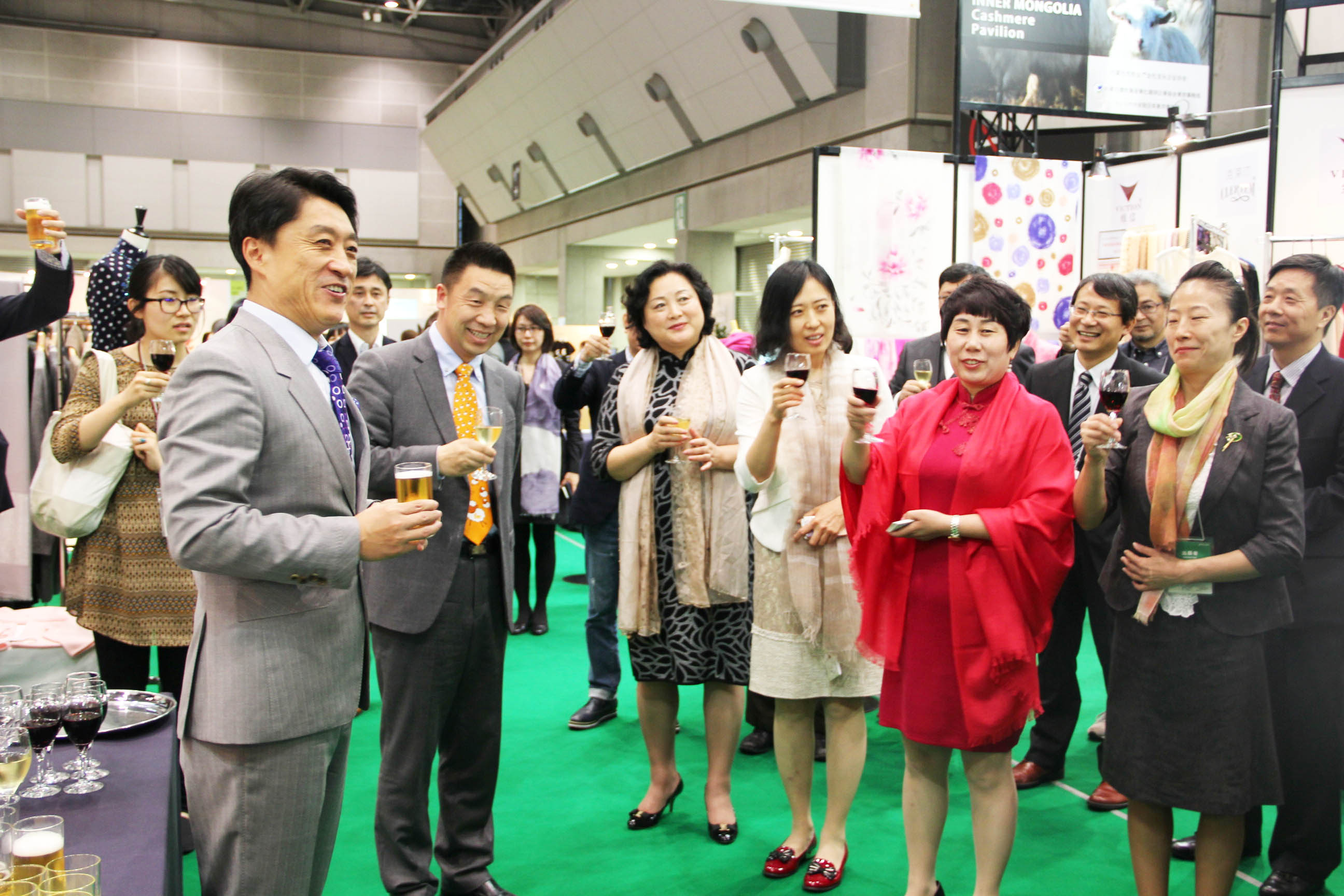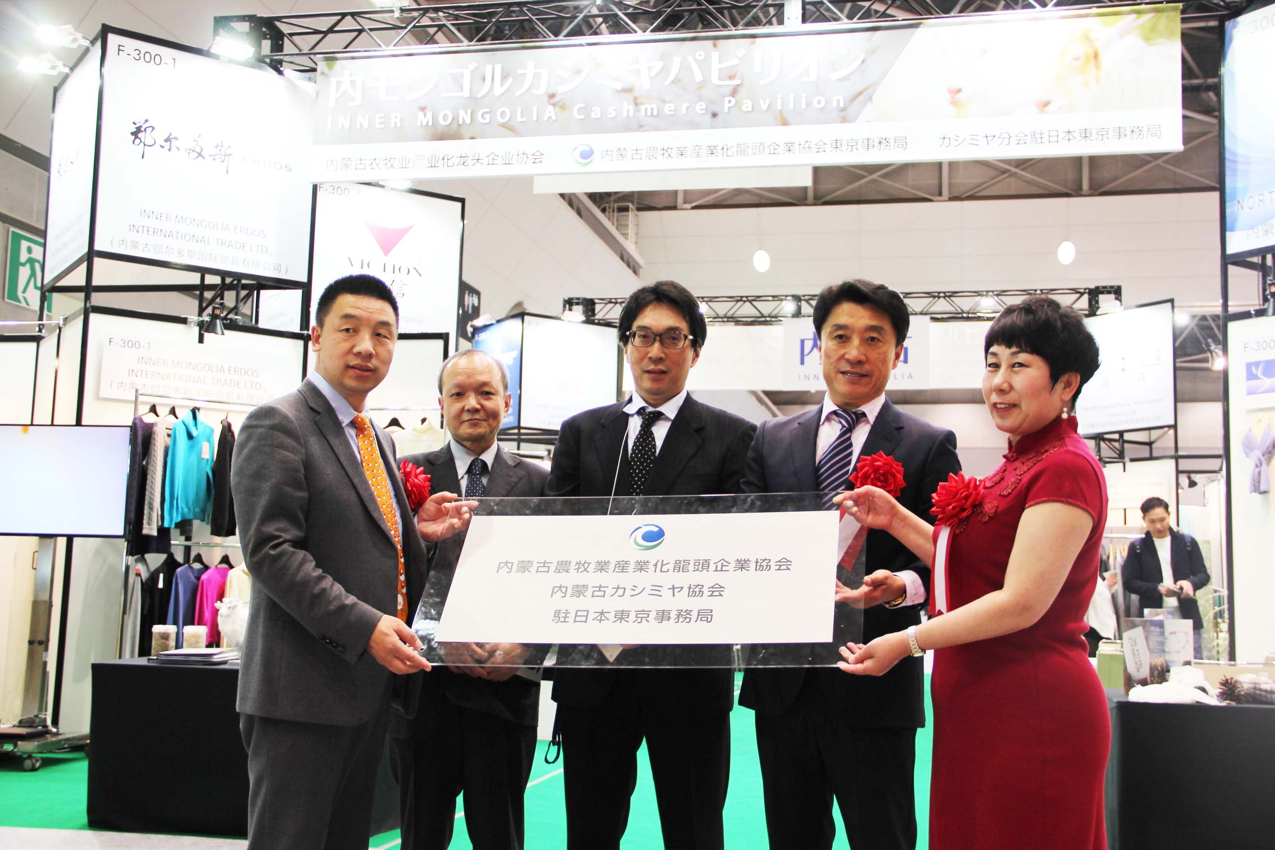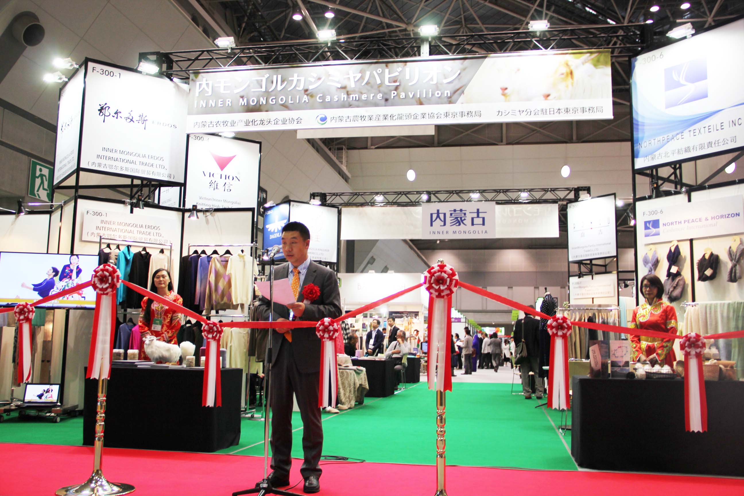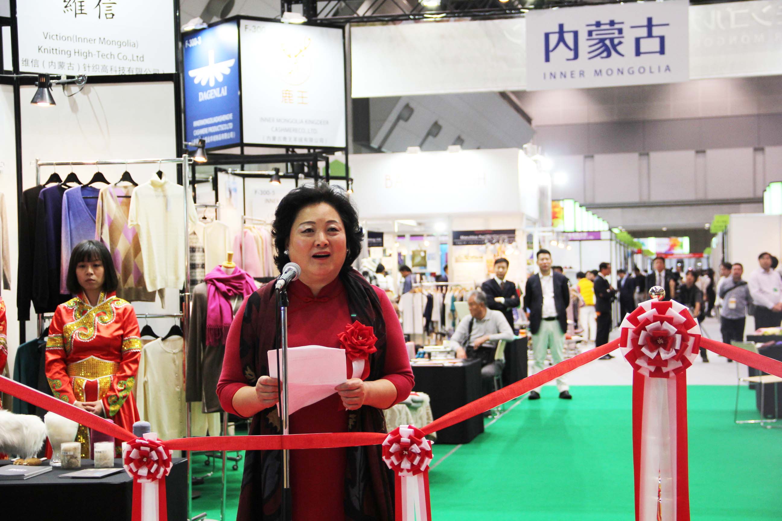 2016426日上午11時,在內(nèi)蒙古羊絨展區(qū)前,舉行了盛大的開業(yè)剪彩儀式,內(nèi)蒙古自治農(nóng)牧業(yè)廳產(chǎn)業(yè)化處副處長郟金梅、內(nèi)蒙古農(nóng)牧產(chǎn)業(yè)化龍頭企業(yè)協(xié)會會長閆樹春、內(nèi)蒙古農(nóng)牧產(chǎn)業(yè)化龍頭企業(yè)協(xié)會羊絨產(chǎn)業(yè)分會會長王風之出席剪彩儀式,并分別就政府支持、協(xié)會服務和企業(yè)自律發(fā)展等幾方面做了精彩致辭。郟金梅副處長表示,希望通過此次活動,使得社會各界代表能夠贏得機遇、拓展空間,取得豐碩的成果,同時真誠盼望各方來賓、新老朋友能夠進一步了解內(nèi)蒙古羊絨,認識內(nèi)蒙古羊絨,并以此為契機,加強內(nèi)蒙古羊絨界與日本企業(yè)的合作,攜手發(fā)展,實現(xiàn)共贏,共創(chuàng)輝煌。閆樹春會長在致辭中講到,我們此行不僅是要展示內(nèi)蒙古羊絨原料優(yōu)勢地位和行業(yè)加工的專業(yè)性,更希望能充分利用各個平臺廣泛交流,探討合作途徑的契合點,推動兩國羊絨行業(yè)多方共贏,共同提升全球市場對羊絨產(chǎn)品的認知度,希望我們的羊絨企業(yè)能團結(jié)一致,實現(xiàn)羊絨產(chǎn)業(yè)的可持續(xù)發(fā)展。羊絨產(chǎn)業(yè)分會會長王風之在致辭中表示,通過內(nèi)蒙古農(nóng)牧業(yè)產(chǎn)業(yè)化龍頭企業(yè)協(xié)會羊絨分會的平臺,我們勢必會在培育超細超長型產(chǎn)絨山羊、提升優(yōu)質(zhì)種群的規(guī)模、建立行業(yè)質(zhì)量標準和抱團發(fā)展,積極進行海外市場渠道、品牌、投資等多方面取得突破性進展,致力于將中國內(nèi)蒙古羊絨打造成為全球性的產(chǎn)業(yè)品牌。