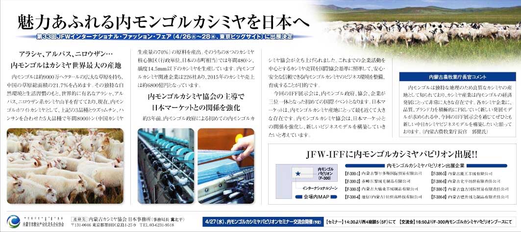 2016419日,內(nèi)蒙古自治區(qū)農(nóng)牧業(yè)廳廳長郭健在IFF報紙上寄語此次活動,希望自治區(qū)羊絨企業(yè)積極推進以創(chuàng)新、品質(zhì)、品牌為核心的發(fā)展新模式。充分利用各個平臺廣泛交流,探討合作途徑,推動兩國羊絨行業(yè)多方共贏,共同提升全球市場對羊絨產(chǎn)品的認知度,希望我們的羊絨企業(yè)能團結(jié)一致,實現(xiàn)羊絨產(chǎn)業(yè)的可持續(xù)發(fā)展。通過這次活動,走出一條中日羊絨產(chǎn)業(yè)創(chuàng)新之路。