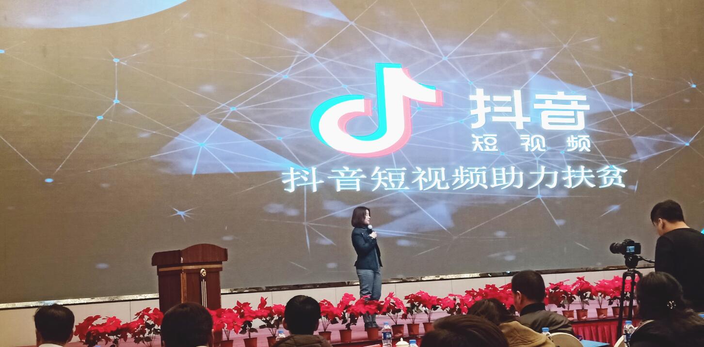 北京字節(jié)跳動科技有限公司政務(wù)總監(jiān)杜曉靜通過旗下今日頭條、抖音、火山、西瓜視頻等為與會企業(yè)講解網(wǎng)紅帶貨模式助力產(chǎn)業(yè)扶貧。
