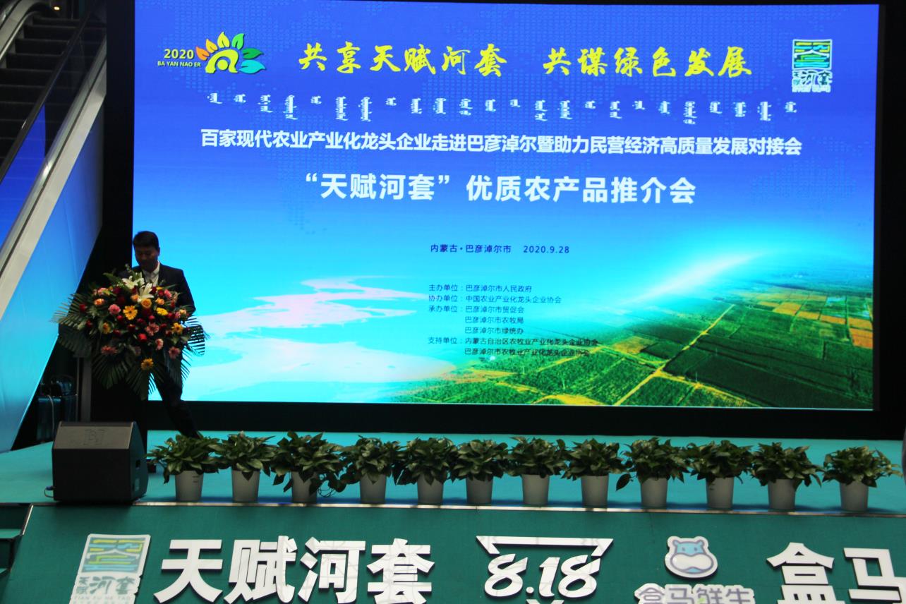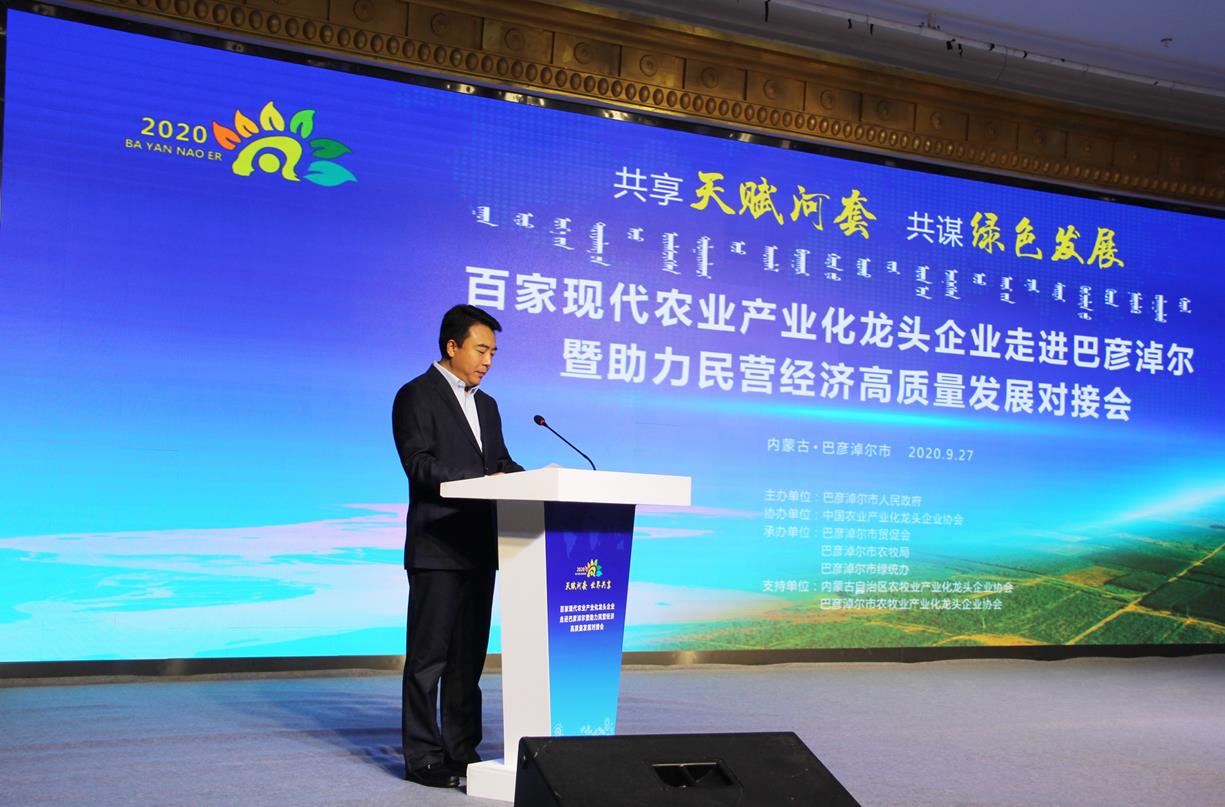 9月27日,由巴彥淖爾市人民政府主辦,中國農(nóng)業(yè)產(chǎn)業(yè)化龍頭企業(yè)協(xié)會協(xié)辦,巴彥淖爾市貿(mào)促會、巴彥淖爾市農(nóng)牧局、巴彥淖爾市綠統(tǒng)辦承辦,內(nèi)蒙古農(nóng)牧業(yè)產(chǎn)業(yè)化龍頭企業(yè)協(xié)會、巴彥淖爾市農(nóng)牧業(yè)產(chǎn)業(yè)化龍頭企業(yè)協(xié)會支持,以“共享‘天賦河套’·共謀綠色發(fā)展”為主題的百家現(xiàn)代農(nóng)業(yè)產(chǎn)業(yè)化龍頭企業(yè)走進巴彥淖爾暨助力民營經(jīng)濟高質(zhì)量發(fā)展對接會在巴彥淖爾市臨河區(qū)召開。中國農(nóng)業(yè)產(chǎn)業(yè)化龍頭企業(yè)協(xié)會會長劉身利,中國農(nóng)科院紀(jì)檢組組長史志國,內(nèi)蒙古自治區(qū)黨委巡視二組駐巴彥淖爾市優(yōu)化營商環(huán)境專項工作組副組長董躍飛,巴彥淖爾市委副書記、市長張曉兵,市人大常委會主任閆鵬,市委副書記、政法委書記李中增,市委常委孫艾芳、王志平出席會議,副市長任逸群作市情推介,內(nèi)蒙古農(nóng)牧業(yè)產(chǎn)業(yè)化龍頭企業(yè)協(xié)會會長周勇應(yīng)邀出席會議。
