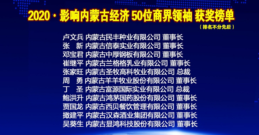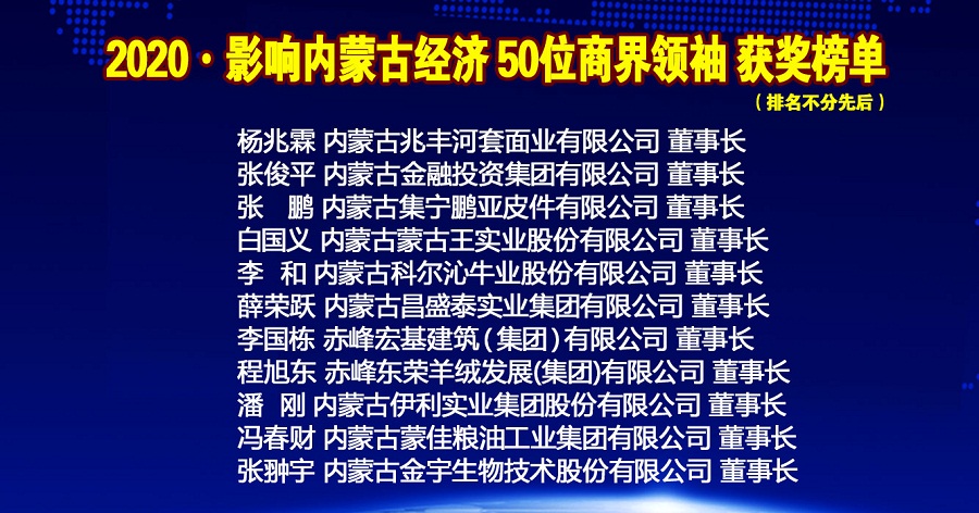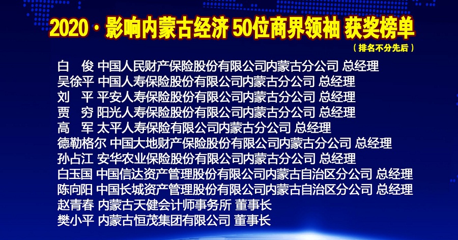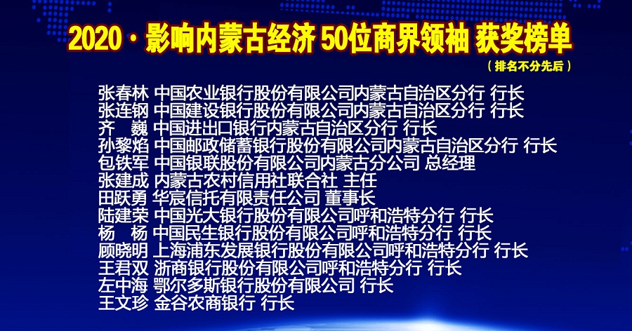 年會上內(nèi)蒙古金融網(wǎng)、內(nèi)蒙古新金融研究院隆重推出2020•影響內(nèi)蒙古經(jīng)濟50位商界領(lǐng)袖榜單,從2015年度開始,每年按照項目發(fā)展,甄選出當年度引領(lǐng)商界風潮的50位內(nèi)蒙古最具影響力的商界領(lǐng)袖。
