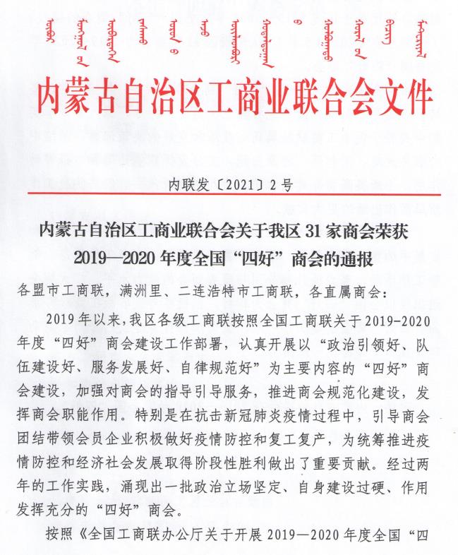 工商聯(lián)所屬商會(huì)是做好民營(yíng)經(jīng)濟(jì)統(tǒng)戰(zhàn)工作的重要組織依托。為深入推進(jìn)工商聯(lián)所屬商會(huì)改革發(fā)展,持續(xù)深化“四好”商會(huì)建設(shè),全國(guó)工商聯(lián)組織開展了20192020年度全國(guó)“四好”商會(huì)認(rèn)定工作,經(jīng)過嚴(yán)格的推薦、初審以及專家評(píng)審組評(píng)審等環(huán)節(jié),日前認(rèn)定了1478家全國(guó)“四好”商會(huì)。內(nèi)蒙古農(nóng)牧業(yè)產(chǎn)業(yè)化龍頭企業(yè)協(xié)會(huì)榮獲全國(guó)“四好”商會(huì)榮譽(yù)稱號(hào)。