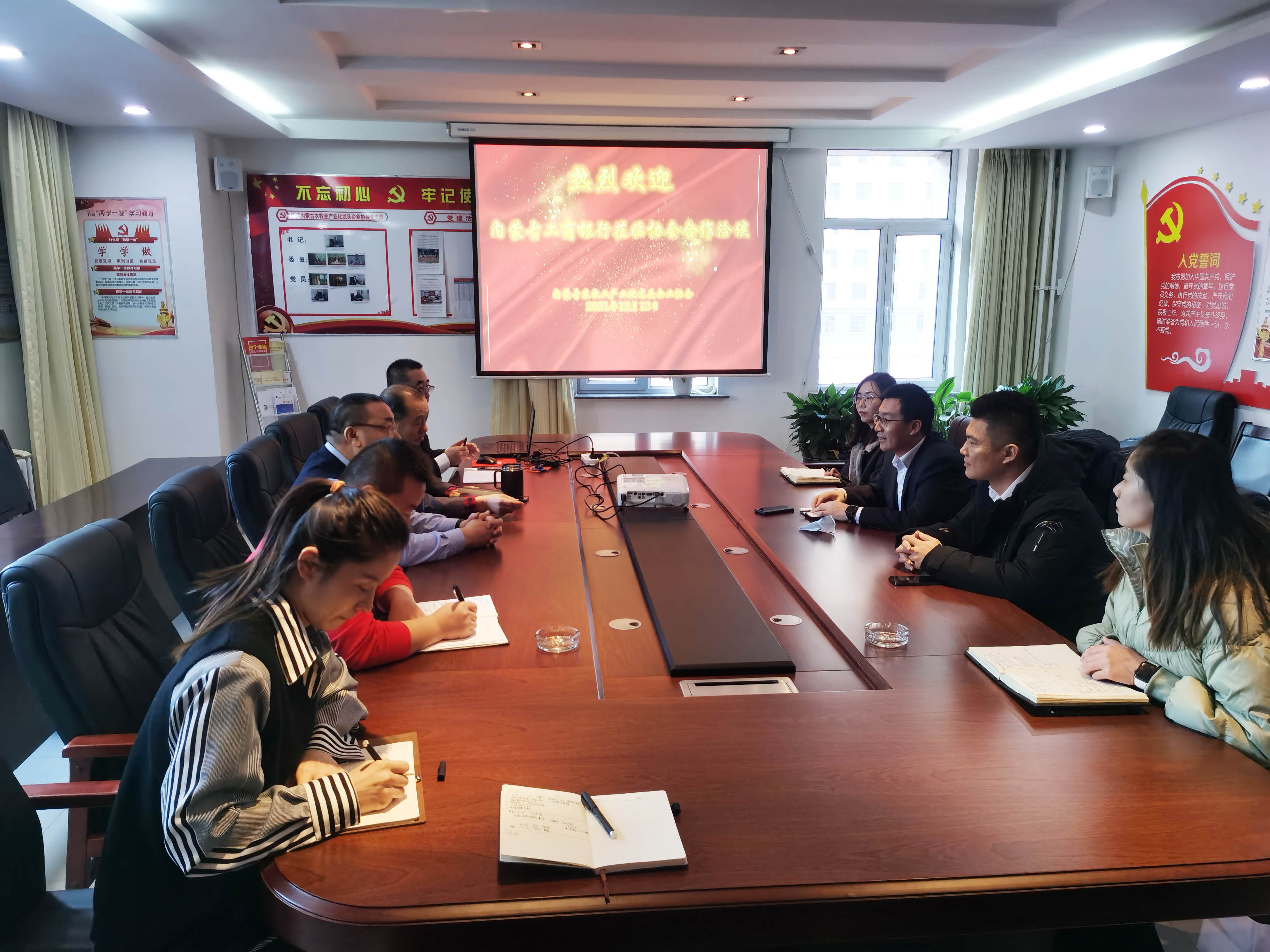 2021年12月13日,工商銀行內(nèi)蒙古分行普惠金融事業(yè)部總經(jīng)理(鄉(xiāng)村振興辦公室主任)王清亮一行5人到內(nèi)蒙古農(nóng)牧業(yè)產(chǎn)業(yè)化龍頭企業(yè)協(xié)會(huì)進(jìn)行合作洽談,協(xié)會(huì)會(huì)長(zhǎng)周勇、執(zhí)行會(huì)長(zhǎng)林永亮、執(zhí)行秘書長(zhǎng)呼群等參加會(huì)議。