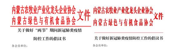 一、內(nèi)蒙古農(nóng)牧業(yè)產(chǎn)業(yè)化龍頭企業(yè)協(xié)會聯(lián)合內(nèi)蒙古綠色與有機食品協(xié)會,先后發(fā)布了《關于做好“兩節(jié)”期間新冠肺炎疫情防控工作的倡議書》和《關于做好新冠肺炎疫情防控工作的倡議書》,引導各會員單位堅決遏止借機囤積居奇、哄抬物價、虛假宣傳等破壞市場秩序、損害消費者合法權益的不法行為,堅決遏制疫情擴展蔓延,積極投身新型冠狀病毒防控戰(zhàn)役中。