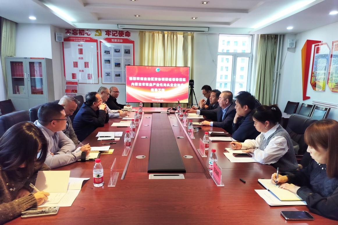2024年12月18日下午,自治區(qū)政協(xié)委員、港澳臺(tái)僑聯(lián)絡(luò)和外事委員會(huì)主任張波,內(nèi)蒙古工業(yè)大學(xué)僑聯(lián)副主席新巴雅爾,內(nèi)蒙古航空職業(yè)技術(shù)學(xué)校校長(zhǎng)、內(nèi)蒙古航空運(yùn)動(dòng)協(xié)會(huì)會(huì)長(zhǎng)趙自強(qiáng),自治區(qū)政協(xié)港澳臺(tái)僑聯(lián)絡(luò)和外事委員會(huì)辦公室主任安勝利一行6人來(lái)協(xié)會(huì)調(diào)研指導(dǎo)工作,協(xié)會(huì)副會(huì)長(zhǎng)單位內(nèi)蒙古凌志馬鈴薯科技股份有限公司總經(jīng)理閆洪志、內(nèi)蒙古民豐種業(yè)有限公司劉榮書(shū),常務(wù)理事單位內(nèi)蒙古額爾敦羊業(yè)股分有限公司董事長(zhǎng)助理畢欣及協(xié)會(huì)秘書(shū)處全體工作人員參加會(huì)議,會(huì)議由協(xié)會(huì)秘書(shū)長(zhǎng)呼群主持。