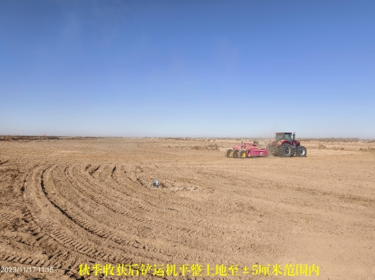 2、磴口縣巴彥套海農(nóng)場(chǎng)機(jī)械隊(duì)地塊屬于2022年高標(biāo)準(zhǔn)農(nóng)田項(xiàng)目區(qū),渠、溝、路、林、田配套到位?;緸閷?00米、長(zhǎng)700米的“條形”土地,激光平整土地誤差在3厘米內(nèi)。2023年全部種植中苜4號(hào)和美國(guó)騎士苜蓿,年內(nèi)平茬收獲2次,現(xiàn)已澆灌冬季保墑水,是認(rèn)證和發(fā)展有機(jī)苜?;氐睦硐胫?。