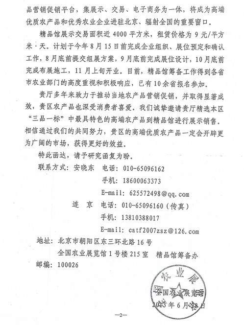 關(guān)于邀請(qǐng)參加全國(guó)優(yōu)質(zhì)農(nóng)產(chǎn)品精品館展示銷(xiāo)售的函