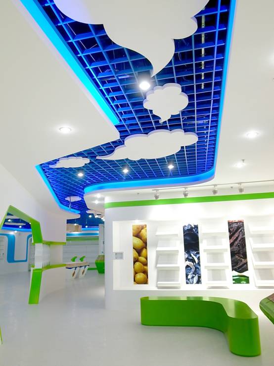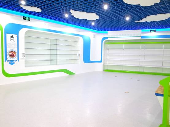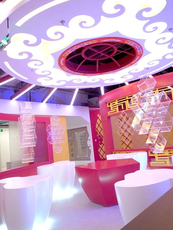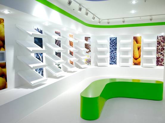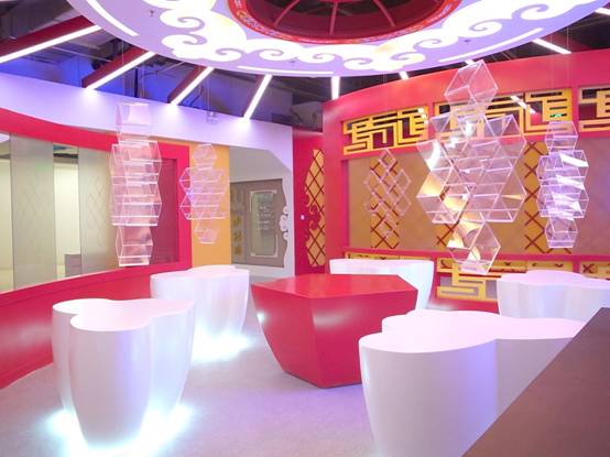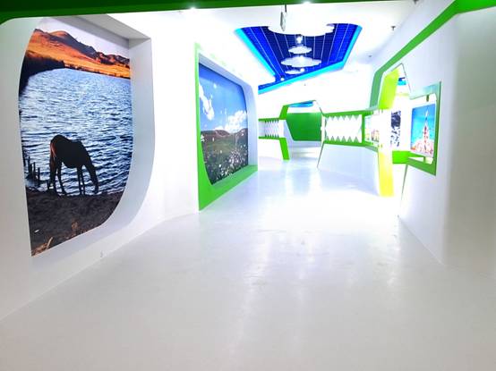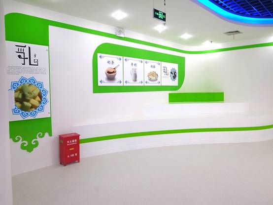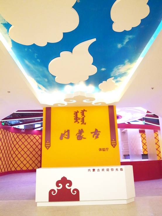 : 上海西郊國際內(nèi)蒙古館現(xiàn)場實景圖,現(xiàn)場分為展示區(qū)和體驗區(qū),展示區(qū)以產(chǎn)品展示銷售為主,現(xiàn)代科技結(jié)合時尚展廳設(shè)計風(fēng)格,藍(lán)綠白相結(jié)合,映襯藍(lán)天、白云、草原;體驗區(qū)突出體驗品嘗、商務(wù)洽談功能,以現(xiàn)代蒙古包造型設(shè)計,突出民族氣息,展現(xiàn)內(nèi)蒙古特色。