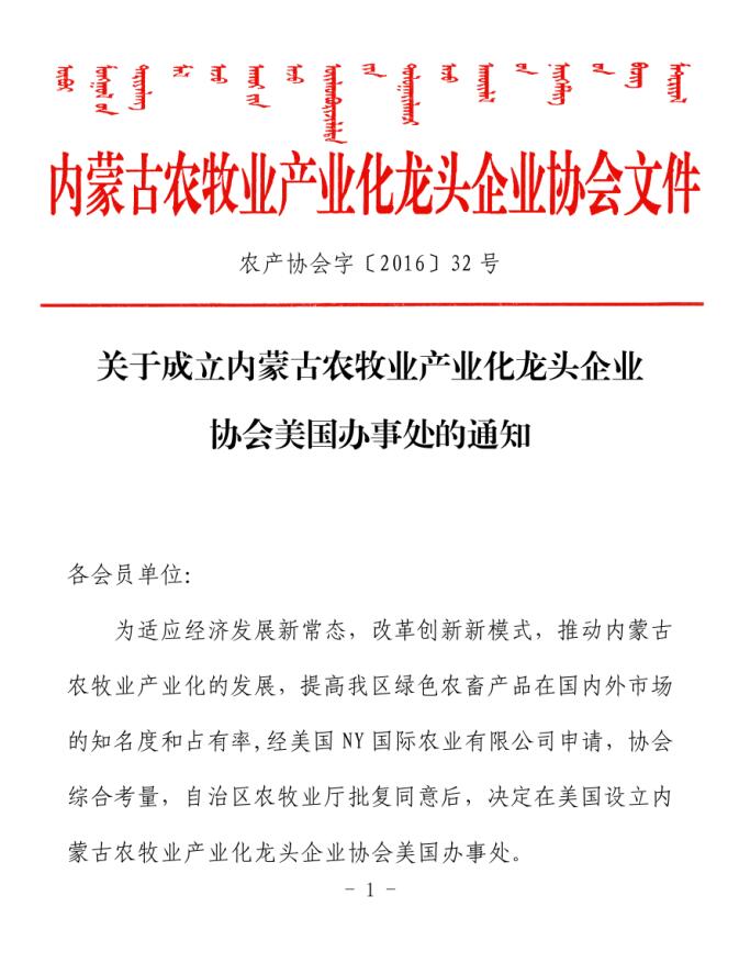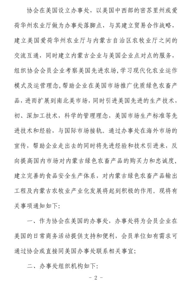 關(guān)于成立內(nèi)蒙古農(nóng)牧業(yè)產(chǎn)業(yè)化龍頭企業(yè)協(xié)會美國辦事處的通知