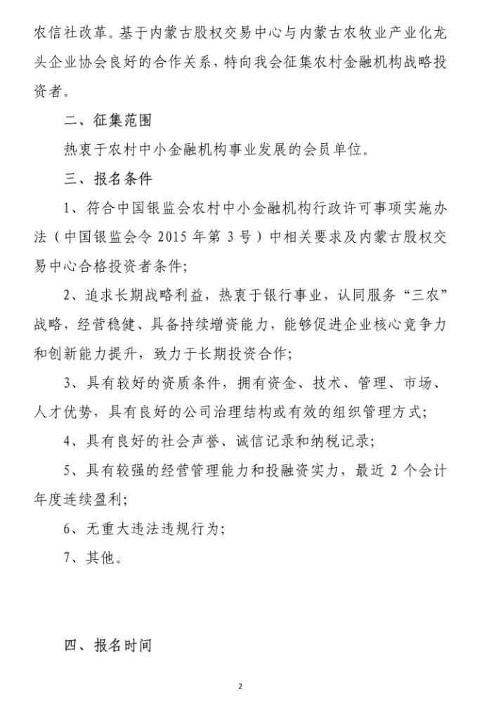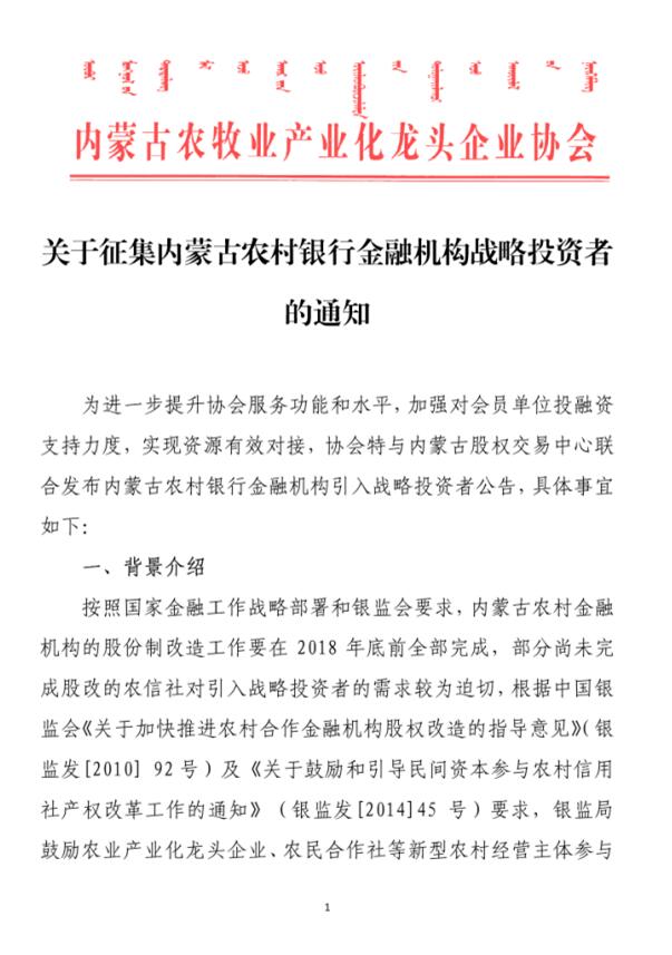 關(guān)于征集內(nèi)蒙古農(nóng)村銀行金融機(jī)構(gòu)戰(zhàn)略投資者的通知