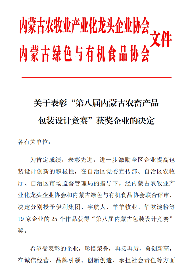 關(guān)于表彰“第八屆內(nèi)蒙古農(nóng)畜產(chǎn)品包裝設(shè)計競賽”獲獎企業(yè)的決定
