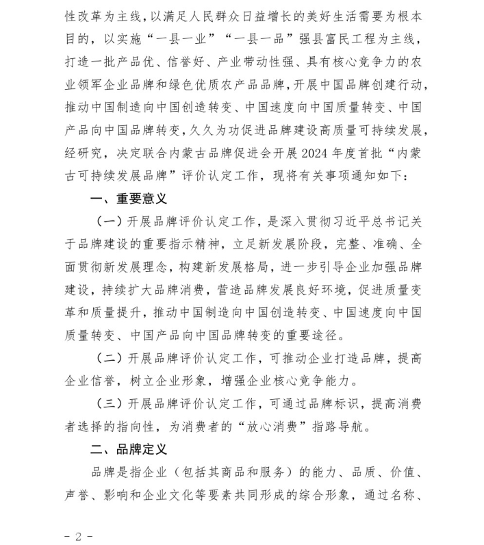 關(guān)于開展2024年度首批“內(nèi)蒙古可持續(xù) 發(fā)展品牌”評價認(rèn)定工作的通知
