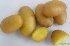 FAVORITA(費(fèi)烏瑞它)1981年由國家農(nóng)業(yè)部種子局從荷蘭引入,山東省農(nóng)業(yè)科學(xué)院蔬菜花卉所引入山東栽培,取名“魯引1號”,1989年天津市農(nóng)業(yè)科學(xué)院蔬菜花卉所引入,取名“津引8號”,又名“荷蘭薯”、“荷蘭七號”、“荷蘭15”,為我國主栽早熟品種之一,該品種出苗后60—70天即可收獲。 [特征特性]該品種早熟,株型直立,株高約60cm左右,莖桿粗壯,分枝少,葉片肥大,葉緣波狀,花淡紫色;結(jié)薯集中,薯塊膨大迅速,長橢圓形,芽眼淺,黃皮黃肉,表皮光滑,食味好,適合加工和出口創(chuàng)匯,在香港及東南亞各國極為暢銷;抗馬鈴薯Y病毒,對A病毒免疫;淀粉12.4%—14%,還原糖0.03%。植株易感晚疫病。塊莖感晚疫病和環(huán)腐病。輕感青枯病、退化快。產(chǎn)量高,畝產(chǎn)2000kg,高產(chǎn)可達(dá)3000kg以上。 [適宜范圍]該品種適宜性較廣,黑龍、遼寧、內(nèi)蒙古、河北、北京、山東、江蘇、廣東、廣西、貴州、四川等地均有種植,是適宜出口的品種。