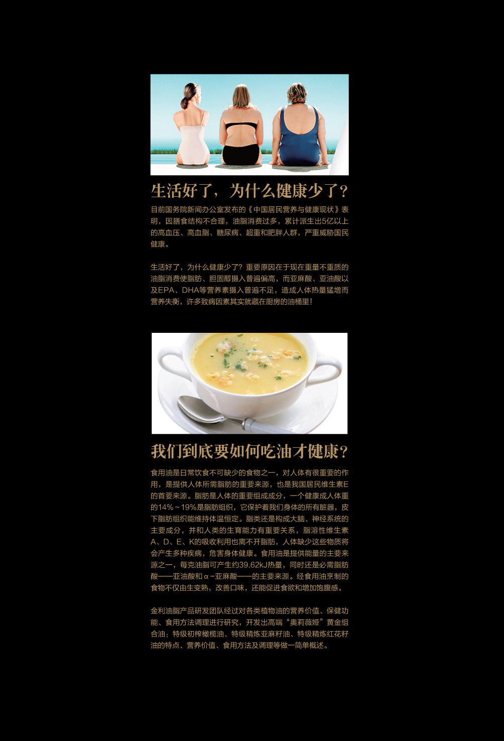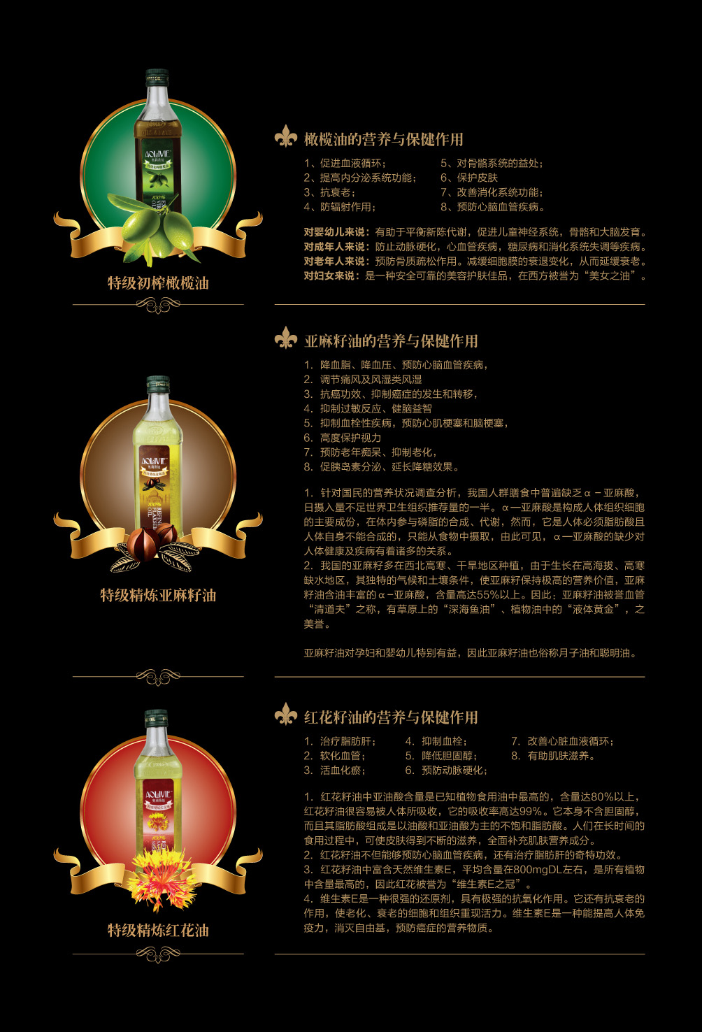 金利油脂(蘇州)有限公司研發(fā)的:“奧莉薇婭黃金組合植物營養(yǎng)油,有各具特色的脂肪酸植物油組合而成,將各種油品進(jìn)行優(yōu)勢互補,科學(xué)的根據(jù)人體營養(yǎng)需求,精心研制出的高端油脂系列產(chǎn)品。具有促進(jìn)大腦發(fā)育/增強視力/降脂/降血壓/抗血栓/保護(hù)前列腺/促進(jìn)脂肪代謝/抗衰老等良好的保健作用。為您均衡營養(yǎng)/增強體質(zhì)而“加油”?!皧W莉薇婭黃金組合油,是有特級初榨橄欖油/特級冷榨亞麻籽油/特級精煉紅花籽油三種油品組成,其中單不飽和脂肪酸/α—亞麻酸和亞油酸,是所有植物油中含量最高植物營養(yǎng)油。