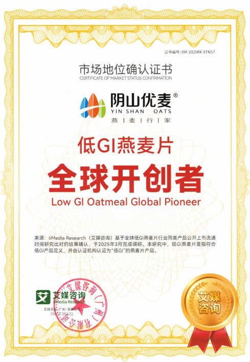 陰山優(yōu)麥此次發(fā)布的新品低GI燕麥片,是其深耕健康食品領(lǐng)域的又一力作。新品不僅通過專業(yè)機(jī)構(gòu)檢測認(rèn)證,獲得“低GI食品認(rèn)證”,同時(shí)陰山優(yōu)麥還獲得了“低GI燕麥片全球開創(chuàng)者”市場地位確認(rèn)證書。